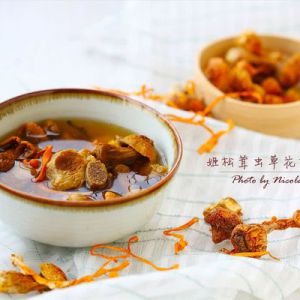 将用净水浸泡后的姬松茸和虫草花一同放入锅中