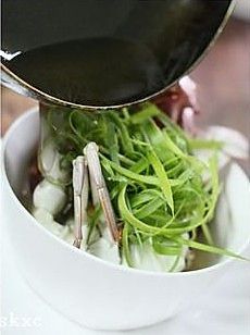 取出螃蟹,将葱丝放在螃蟹上,另锅烧热油,淋于葱蟹上,即成