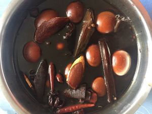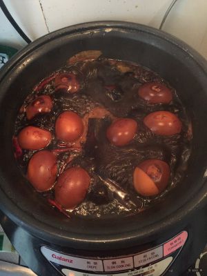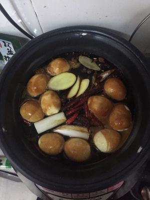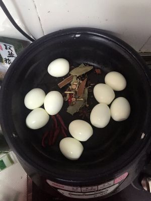 将鸡蛋煮熟剥皮放入锅中待用,将事先准备的干料都放入锅中,如图,这个地方我为了省事儿放了一包炖肉料,超市很容易买到,自己又放了点辣椒花椒桂皮香叶,我喜欢味道重一些!