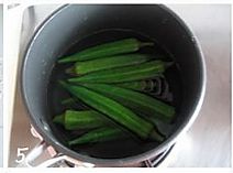 锅中放入开水、盐,将秋葵放入焯烫一下后捞出,沥干水分。(秋葵先用凉白开洗净)