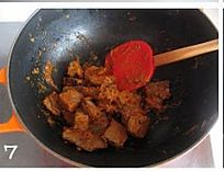 牛腩放入锅中,加入 MAK NYONYA娘惹咖喱酱,小火翻拌下,将咖喱渗入牛腩中。