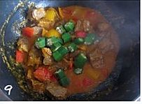 煮至20分后加入红椒和黄椒翻拌下,继续用中小火煮。煮至35分钟左右加入秋葵稍翻拌下继续煮5分钟左右即可(共计40分钟左右)最后加入椰丝,稍翻拌下即可。