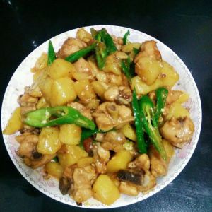 先放姜蒜 辣椒干 然后鸡块倒进去翻炒 再倒老抽生抽 待鸡块入味 土豆倒进 一罐啤酒 放点八角 中小火去闷