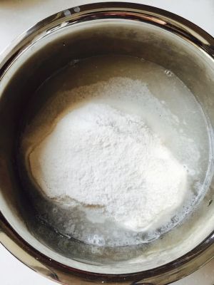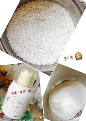 40℃的水(手感温乎,但不烫手)中加入酵母,白糖搅拌均匀,再加入米粉,搅拌均匀。盖上保鲜膜发至两倍大。