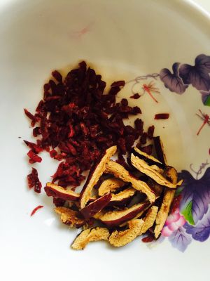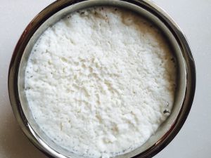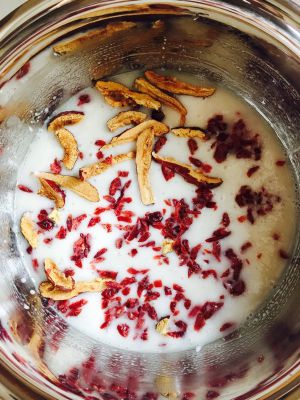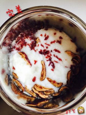 将容器中涂抹油(以防粘),倒入米粉,表面均匀撒上红枣丝,蔓越梅。