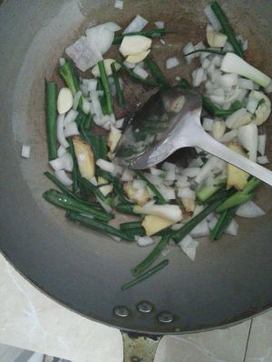 2.把鸡爪用水焯烫好,备用,!锅内放油 把葱.姜.蒜.洋葱粒放入锅内炒出香味。