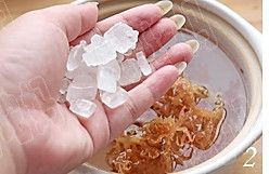 取一砂煲,倒入血珊瑚草,加入适量清水,再加入冰糖;