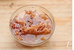 血珊瑚草过清水冲洗去盐分,泡发8-10小时,中途换水三至四次,再冲洗数遍,滤干水分;