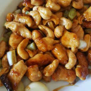鸡肉锅中放入葱姜蒜粒。翻炒爆香。放入上面酱汁1分钟收汁。关火。倒入腰果拌匀装盘。