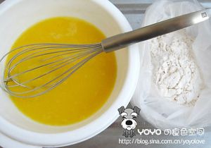 湿料:鸡蛋5个(约250g),浓缩橙汁100g,橄榄油100g,柠檬屑2勺;
