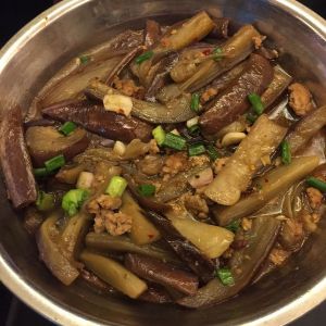 肉用蒜头爆香,放点老干妈辣椒酱,变色后加入备用的茄子,加入调味料:淀粉,酱油,糖,水。煮到茄子烂。