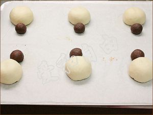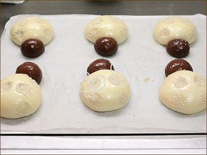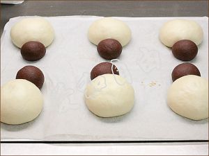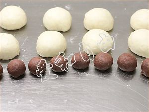 6.白面团分割成40克/个,可可面团分割成10克/个。