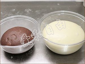 3.分割出320克面团,剩余的面团加入事先混合好的1/2大匙水和1/2大匙可可粉揉匀。