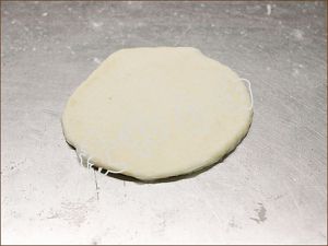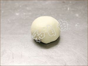 14. 擀面杖蘸水,沾上白芝麻后轻压在面团上。