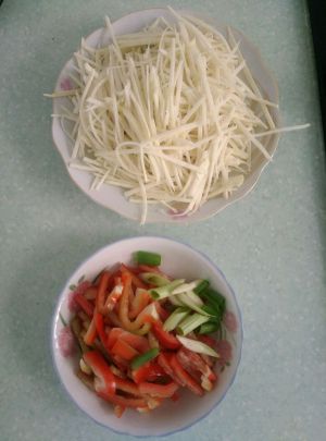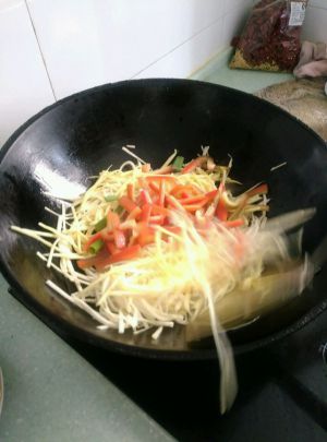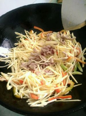 油热后将准备好的食材倒入翻炒,加入肉丝
