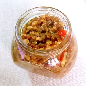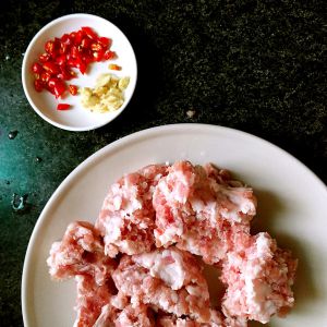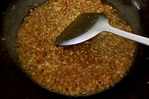 2.待蒜金黄放辣椒翻炒,再加入肉末