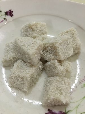 吃之前切成小方块,椰蓉里滚一圈,就可以吃啦