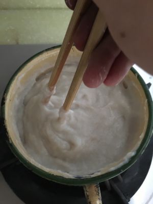 慢慢加入融化的淀粉,边加入边搅拌,直至浓稠。(加入淀粉越多,越浓稠,越浓稠后期切块成品越容易成型)