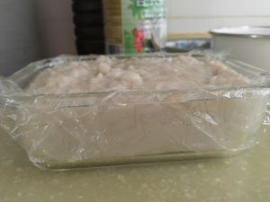 容器里垫上保鲜膜,倒入稍凉的混合物,用刮刀刮平,冷藏。