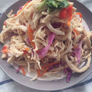 装盘。放点香菜。夏日吃酸酸辣辣超级美味。不喜欢辣的可以直接姜蒜,柠檬汁搅拌下。(这是2块鸡胸肉,1块就够了)