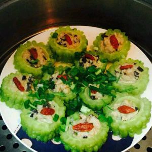 [偷笑]五花肉剁馅儿(可以加点香菇、黑木耳)...肉馅调好...苦瓜切段...放入肉馅....蒸10分钟即可[调皮][调皮]