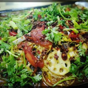 将调味汁均匀浇上,另起锅入油(油稍多),加入花椒煸出香味(注意不要煸煳,花椒数量根据自己口味确定)浇上;