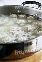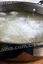 调小火,用虎口将丸子一个一个挤入锅中,撇净浮沫,煮两三分钟;