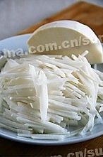 锅中水沸后,放入萝卜丝,水再沸加少许盐继续开盖将萝卜煮熟;