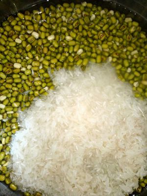 把绿豆和大米浸泡两个小时,多洗几次绿豆,除去绿豆渣,混匀加水