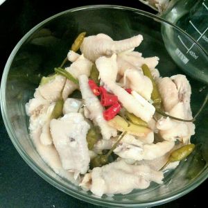 2入冷水煮 水中加料酒 几片姜 煮至鸡爪软烂即可