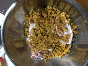 和三层肉泥+生抽+料酒+老抽+糖+半个全蛋液顺时针拌匀