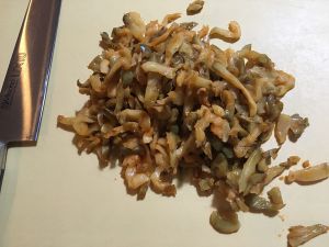 然后将卷起来的皮对折再对折然后擀成圆皮,包上榨菜肉馅,褶皱朝下闭口