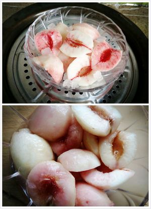 在碗里放入冰糖,加入少许纯净水,入锅里最少蒸三十分钟。取出,凉冷,装入带盖的瓶子里放入冰箱,想吃的时候取出来吃就行了。自制桃罐头就做好了。