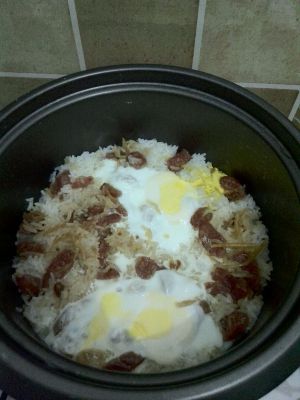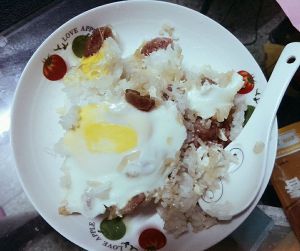 炒好后,饭也差不多了。就把腊肠压进饭里。然后鸡蛋也打进去