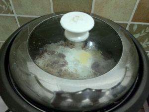 煮饭的同时,切好腊肠,然后放进电磁炉锅里加入黄豆酱等调味料炒入味