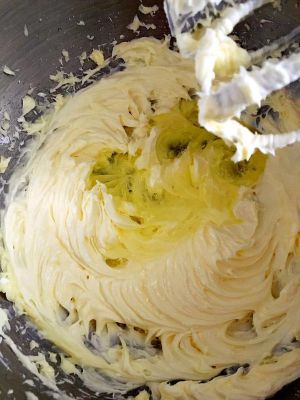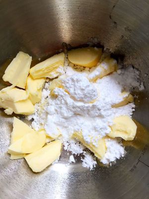 黄油切小块室温软化,加糖打发至颜色发白蓬松
