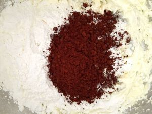 筛入低筋面粉,可可粉及盐,用刮刀翻拌均匀