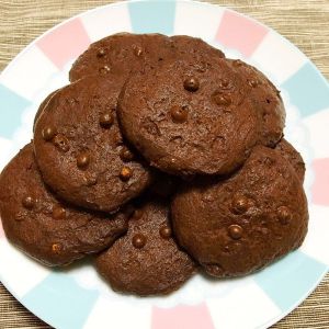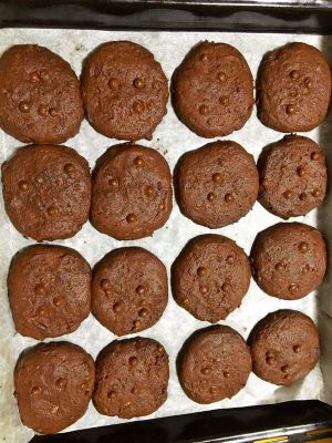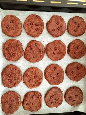 拌匀后用手按压成一个个圆形,排放在烤盘上,并在表面按几颗巧克力豆