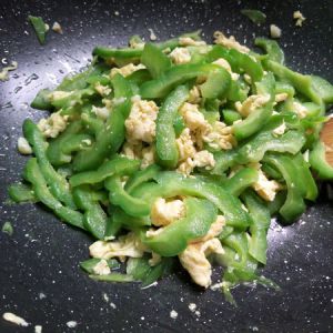 苦瓜熟了(不喜欢炒太老),下鸡蛋,翻翻炒炒~
