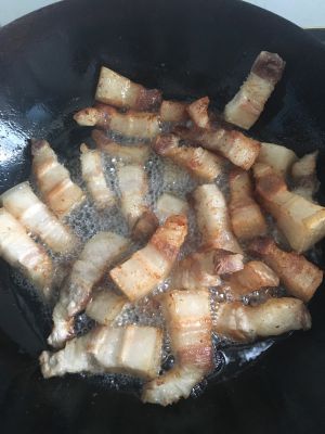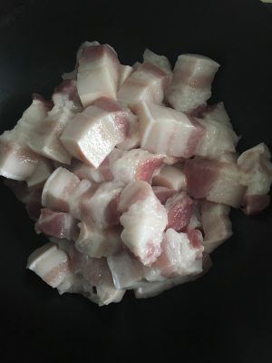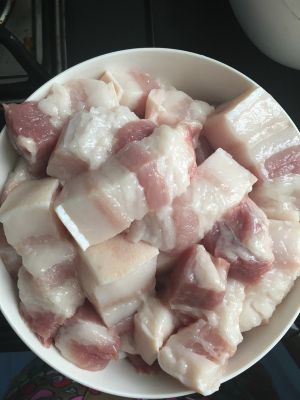 肉倒入锅中,加冷水,刚好两大碗水满上,忘拍图了,抱歉抱歉,煮10分钟左右把肉捞起出锅,把水倒了,洗净锅,然后再把肉倒入锅中,不要放任何油。记住不要放油,直接把肉放进锅中,先开大火3分钟,再开小火10分钟,把肉本身的油榨出来,期间要经常翻一翻肉
