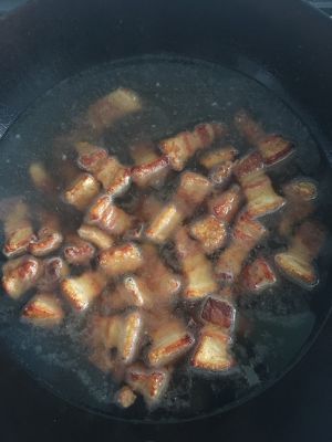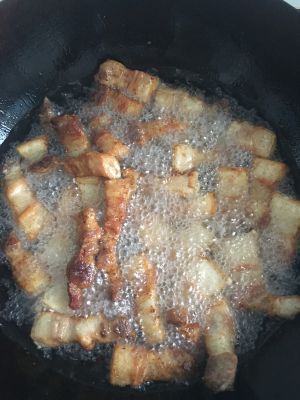 再转大火继续把油熬出来,瘦肉查不多都颜色很好看了,肥肉差不多油都出来了,把肉捞出,油盛到容器里,可以把油炒菜吃