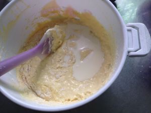 用刮刀翻拌手法把粉均匀,不要过度搅拌以免起筋。