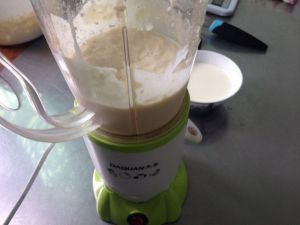在80克奶油中取20克奶油跟榴莲果汁机搅拌均匀。