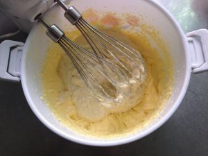把打好榴莲跟奶酪糊用电动打蛋器打均匀。