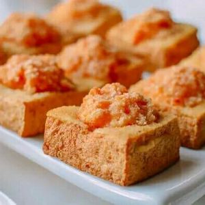 豆腐、半斤虾、1.25茶匙盐、1茶匙香油、半匙绍兴酒、1.5茶匙淀粉、新鲜的白胡椒粉、2汤匙生粉、4杯油、