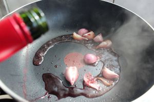 另取一锅,适量橄榄油,爆香洋葱,再倒入小半杯红酒,烧开成汁