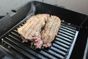煎锅,适量橄榄油,热锅凉油,小火,把羊扒放进去煎制。
