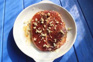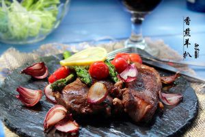 解冻后的羊扒,加适量盐,半茶匙黑胡椒,1汤匙生抽,2汤匙红酒,2汤匙橄榄油,适量蒜末。几滴柠檬汁,抹匀腌制十分钟