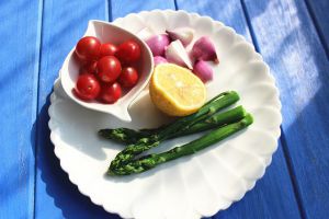 小洋葱洗净切小块,圣女果洗净备用。芦笋焯水。