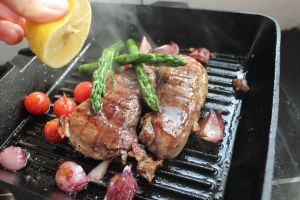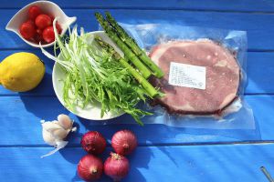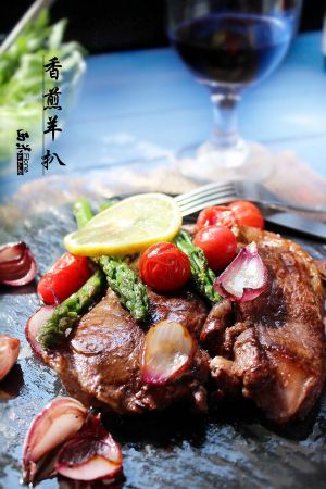 羊扒一面各煎3分钟左右。把汁和洋葱直接浇在羊扒上。加入圣女果,芦笋,煎一会儿。挤上柠檬汁